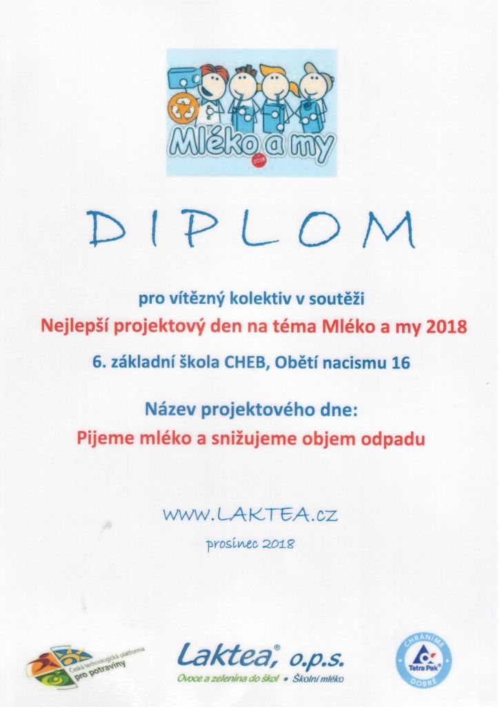 Žáci 5. B se pod vedením paní učitelky Laxové a paní učitelky Kofránkové zapojili do celostátní soutěže Mléko a my. V rámci projektového dne se žáci zapojili do několika aktivit. Vyplnili pracovní listy, osvěžili si znalosti o mléčných výrobcích a vyzkoušeli si aktivity spojené se snižováním objemu odpadu po dopití mlíček v krabičkách. Díky těmto aktivitám jsme s naším projektovým dnem Pijeme mléko a snižujeme objem odpadu vyhráli hmotné ceny v kategorii Nejlepší projektový den na téma Mléko a my 2018.