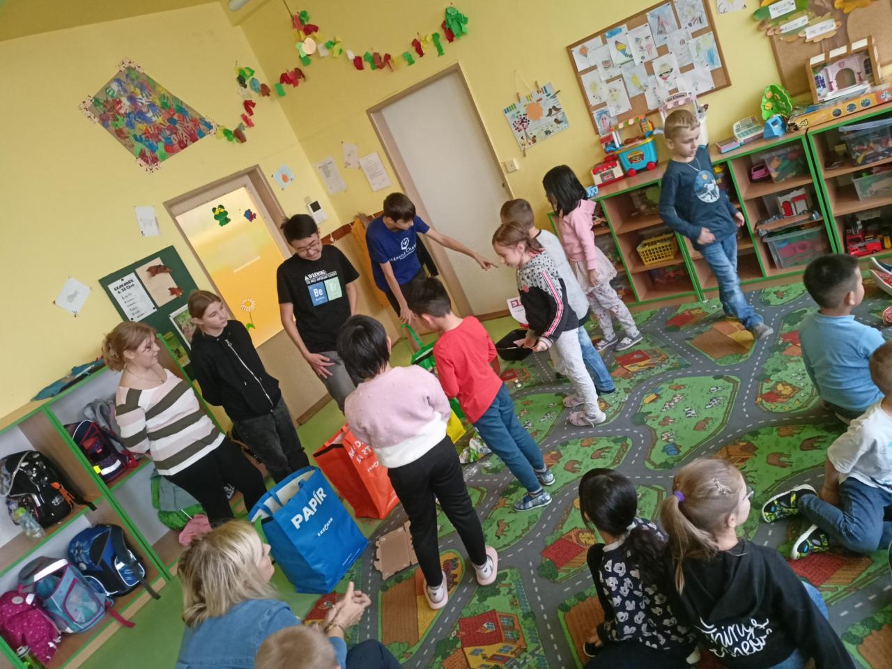 Na procvičení nabytých znalostí vytvořili členové ekotýmu pro prvňáčky "skládku odpadků", kterou prvňáčci úspěšně roztřídili do připravených třídících nádob.
