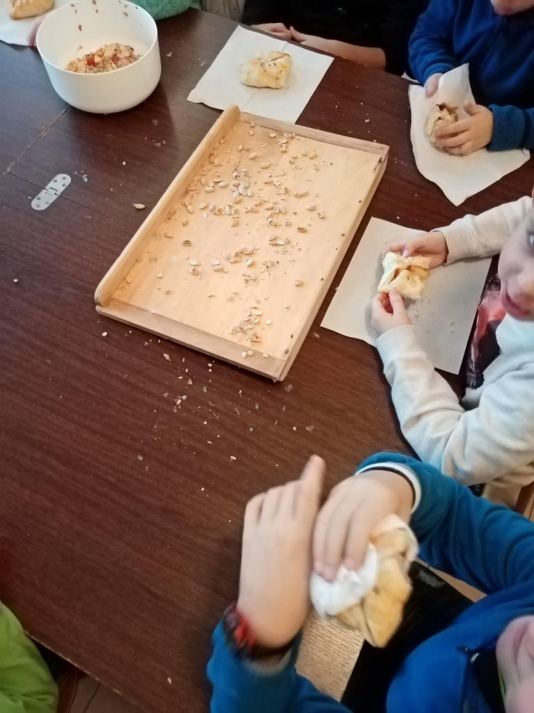 Ekokroužek na podzim pravidelně navštěvuje školní kuchyňky. Tato návštěva se nesla ve znamení pečení sladkých jablečných taštiček. Kazdý dostal kousek listového těsta, lokální jablíčka a vytvaroval si taštičku podle fantasie.