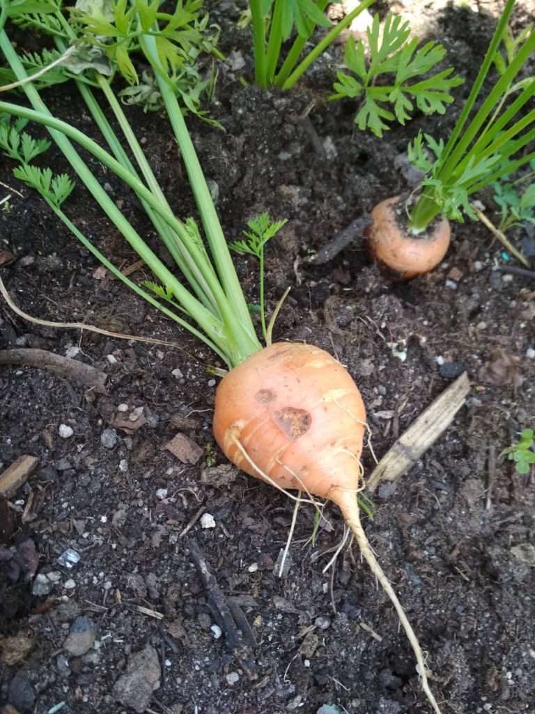 Červenec nám ale přinesl příjemné překvapení - malé kulaté mrkvičky! Pár mrkvových semínek vzešlo a urodila se malá kulatá mrkev. Srpnové vysoké teploty a dlouhodobá sucha nám na záhonku bohužel zlikvidovaly úrodu bylinek, fazolí a hrášku. Od září se však budeme společně s žáky a ekotýmem věnovat pravidelné péči o záhonek.