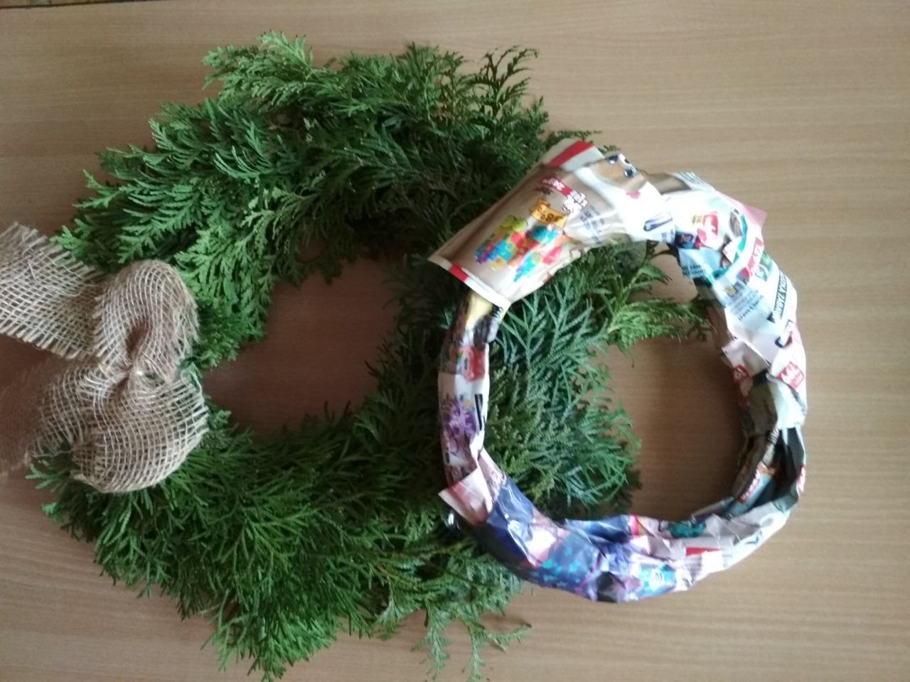 Žáci si vytvořili z novinového papíru a letáků základ pro vázání věnců. Následně se naučili, jak na kruhový základ věnce navazovat jehličí. Výsledný věnec se žákům povedl a vypadá velmi zdařile. Navíc na první pohled nikdo nepozná, že jsou základem věnce staré letáky a novinový papír.