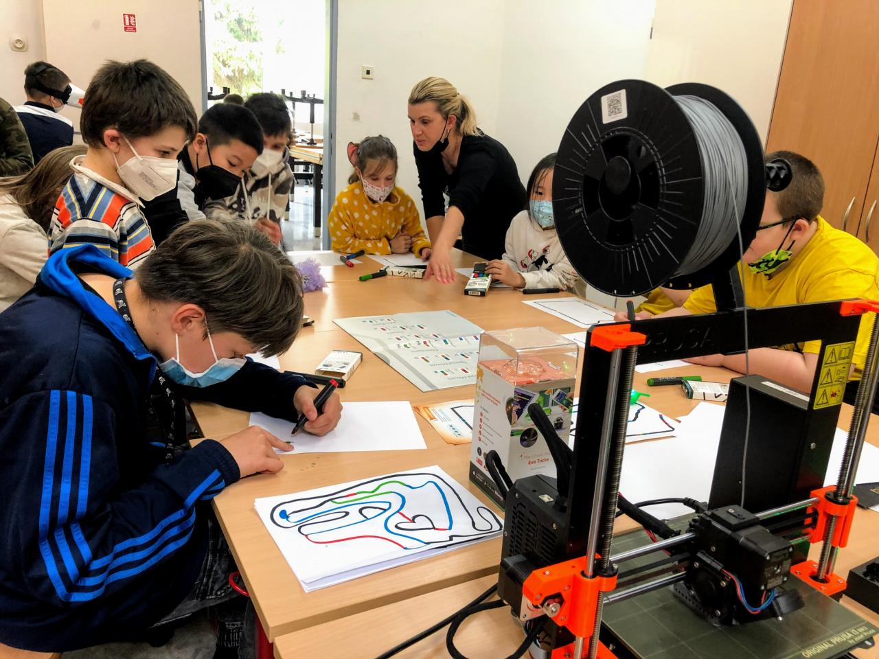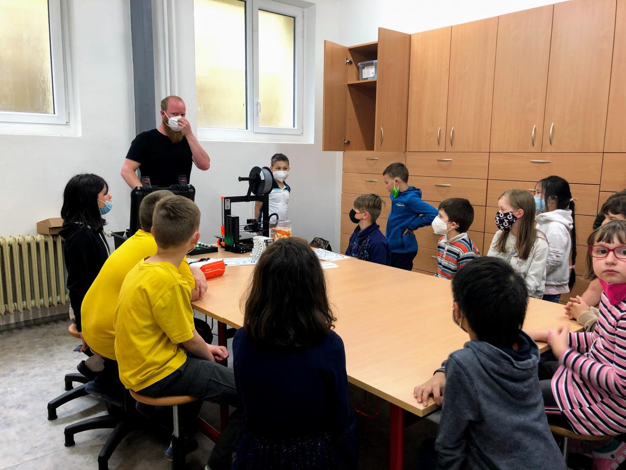 Dne 26.5. se děti seznámily s 3D tiskárnou a jejich výrobky. Zkusily si samy nakreslit mapu, po které jezdili malý ozoboti a také pohled s 3D brýlemi (s virtuální realitou).