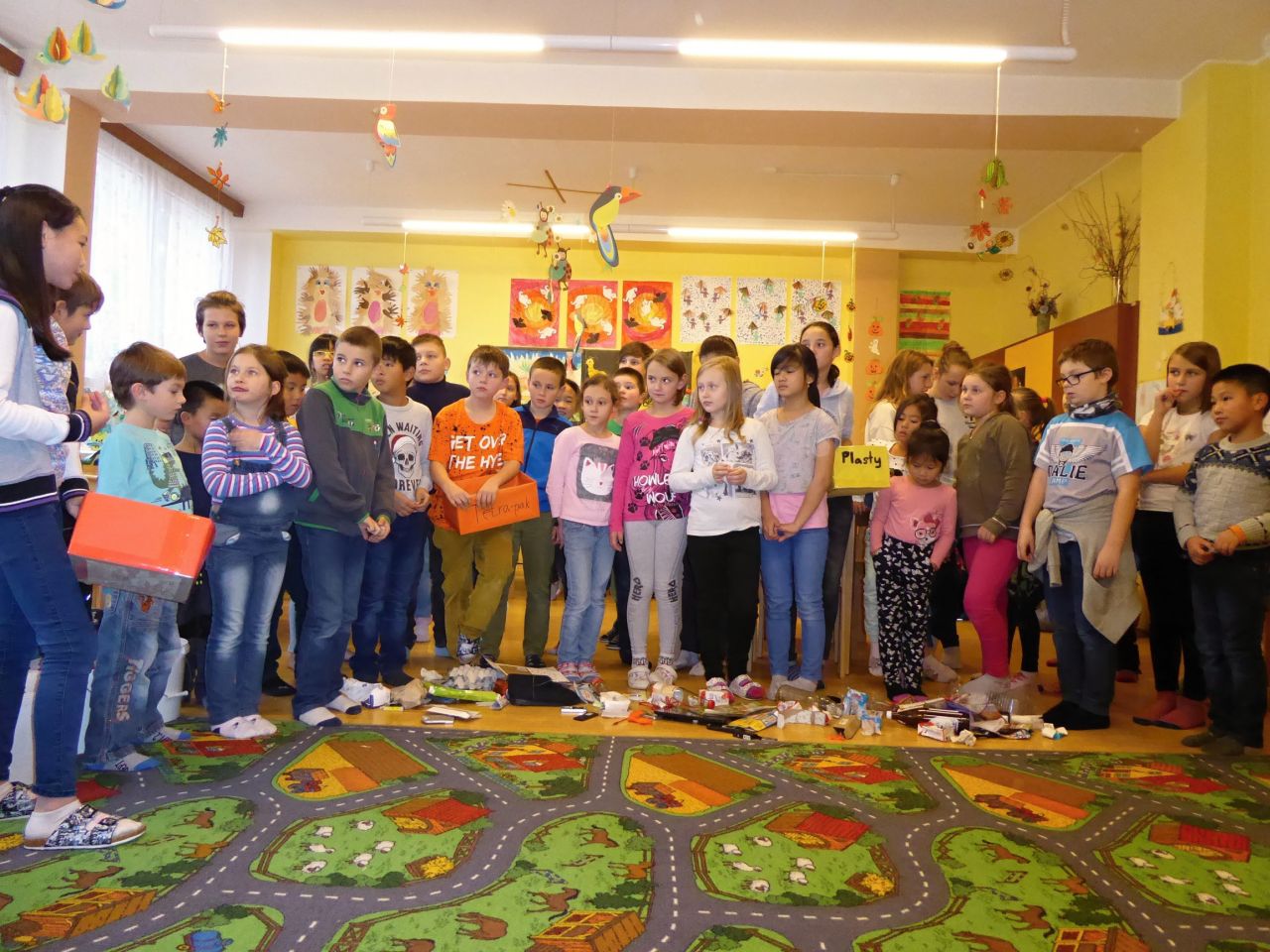 Ve středu družinu navštívily děti z Ekotýmu. Malí lektoři z Ekokroužku měli připravené otázky. Zjišťovali, zda naši malí žáčci umí třídit odpad. Následně děti formou hry třídily uměle vytvořenou skládku do barevných papírových popelnic. Paní učitelka nás dále seznámíla s užíváním vermikompostéru, který jsme si prohlédli. Urbalive je nádoba určena k domácímu kompostování kuchyňského bioodpadu pomocí kalifornských žížal. Tento odpad žížalky hbitě promění v největší poklad- úrodný humus. Velké poděkování Ekotýmu.