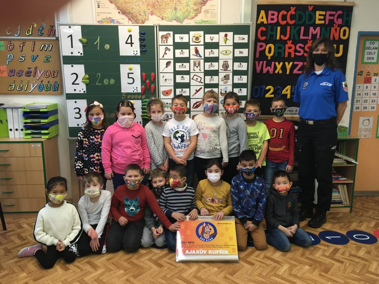 Na přednášce s preventistou kriminality MP Cheb si žáci 1. B vyprávěli o běžném nebezpečí a jak se při možných situacích chovat, např. nález injekční stříkačky, oslovení cizím člověkem, chování v silničním provozu :-).