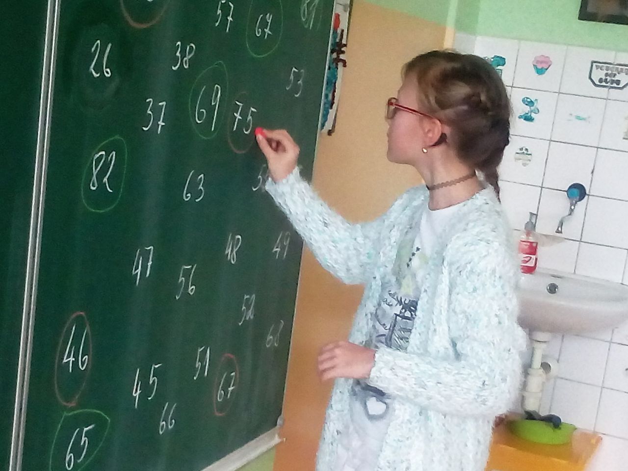 Vždy jedno dítě ze dvou skupin mezi sebou soutěží, kdo dřív najde řečené číslo, zakroužkuje ho. Vyhrává družstvo s vyšším počtem zakroužkovaných čísel.