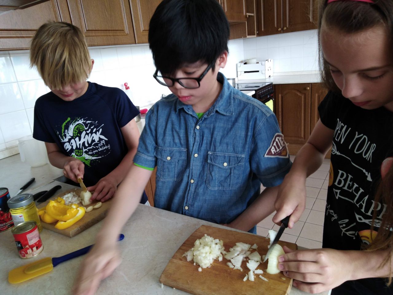 Pracovní listy s různými úkoly nám ukázaly, jak žijí stejně staré děti v Africe. Mnoho jich žije na ulici – mají štěstí, že je tam hodně teplo! Ochutnali jsme hlavní pokrm chudých lidí – fungee, Byla to vlastně kukuřičná kaše se zeleninovou omáčkou a nutno říci, že toto velmi levné a zdravé jídlo nám moc chutnalo – vylízali jsme misku i hrnec od omáčky a postoupili k dalším ochutnávkám. Trochu nás zklamaly smažené banány, syrové jsou rozhodně mnohem lepší. Angolské rizoto jsme jedli docela s chutí a závěrečné jídlo pro bohaté, to bylo vlastně kuře s brambory a zeleninou, už někteří z nás do sebe prostě nedostali, protože jídlo pro chudé nás zasytilo. Kromě vaření nás překvapila velmi nízká spotřeba vody. Na den a osobu jim stačí jen cca deset litrů! Když jsme ale viděli, že vodu nosí ženy kanystrech na hlavách od stovky metrů vzdálené studny, pochopili jsme, že to není tak jednoduché, jako otočit doma kohoutkem… Dětské hry jsou mnohem jednodušší, dokážou vyhrát prakticky se vším. Vyzkoušeli jsme si i pletení copánků, pro některé kluky to byl nezvládnutelné úkol. Celá akce byla velmi zajímavá. Uvědomili jsme si že, máme spoustu věcí a jídla, které vlastně v takovém množství ani nepotřebujeme a snad si ho do budoucna budeme alespoň víc vážit.